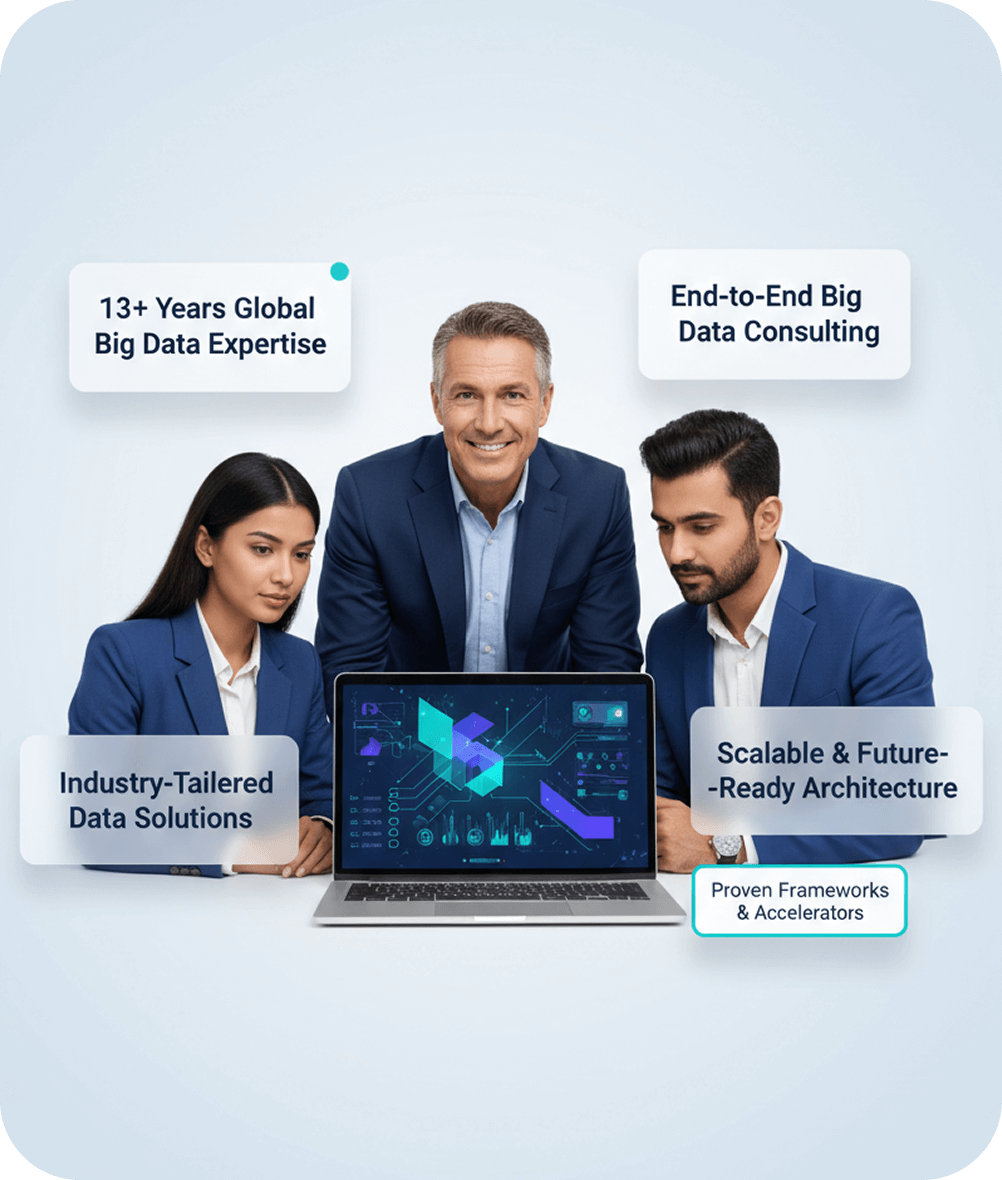 With years of experience in big data consulting across industries, we bring the tools, frameworks, and talent needed to deliver measurable outcomes and long-term competitive advantage.